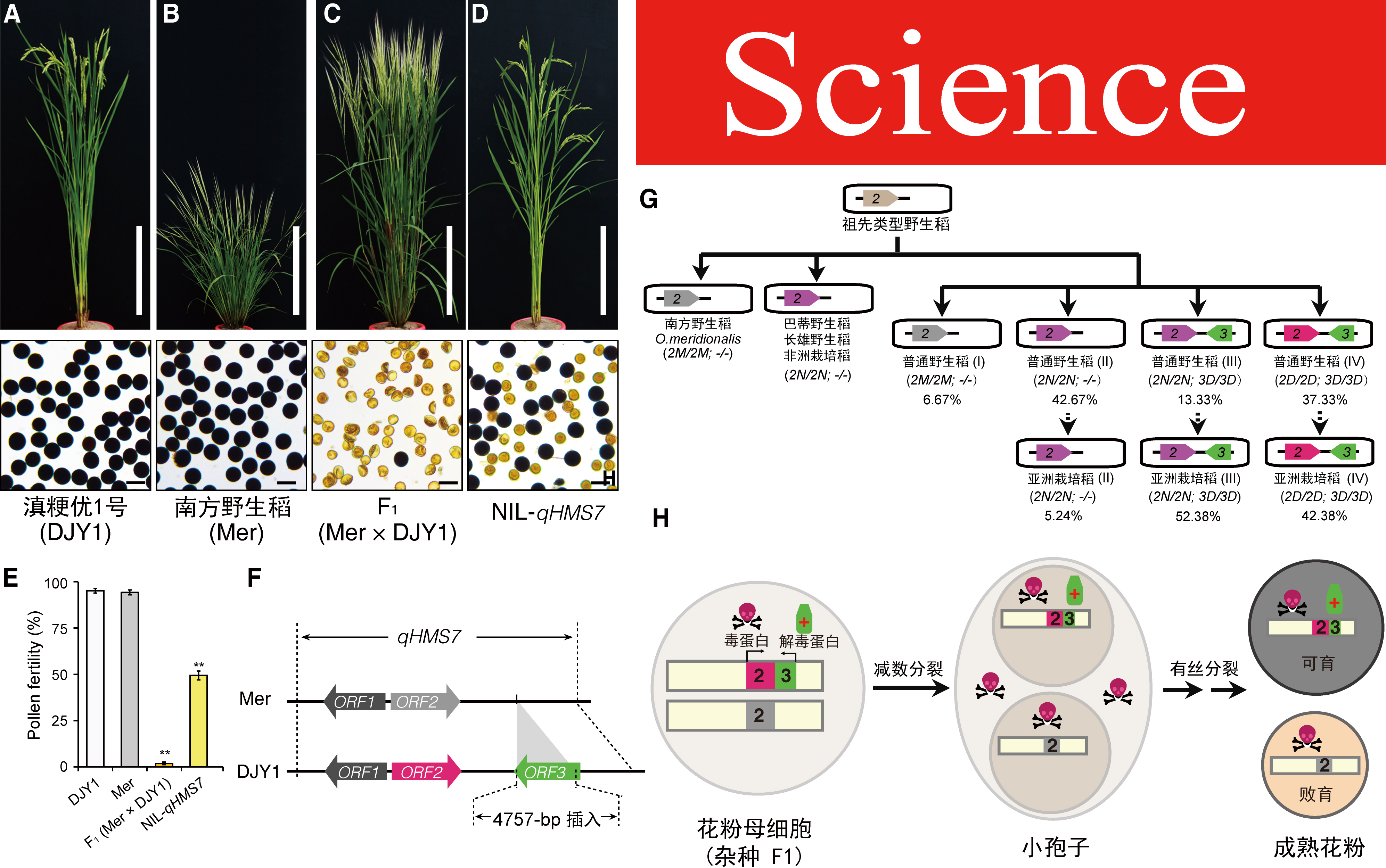 研究发现,水稻杂种不育性受水稻自私基因位点qHMS7的控制,并发现水稻包含三个紧密连锁的基因ORF1、ORF2和ORF3,其中ORF1基因编码一个未知功能的蛋白;ORF2基因编码一个杀配子的毒性蛋白,以母体效应导致花粉死亡;而ORF3基因编码一个解毒蛋白,以配子体效应保护配子,使携带ORF3基因的花粉可育。在“祖先野生稻-普通野生稻-亚洲栽培稻”的演化过程中,ORF1一直被保留,ORF2从没有毒性功能逐步演变成有毒性功能的类型,ORF3是在普通野生稻中由ORF1基因复制产生,并获得解毒功能,在随后的稻种驯化过程中被选择传递到亚洲栽培稻品种。研究表明,粳稻品种同时携带毒性的ORF2和解毒的ORF3,而南方野生稻只含有无毒性的ORF2,在其杂种F1中,携带南方野生稻基因型的花粉因缺乏ORF3保护而死亡,携带粳稻品种基因型的花粉因有ORF3保护而存活,最终导致后代中没有纯合的南方野生稻基因型个体存在,群体分离不符合经典的孟德尔遗传模式。