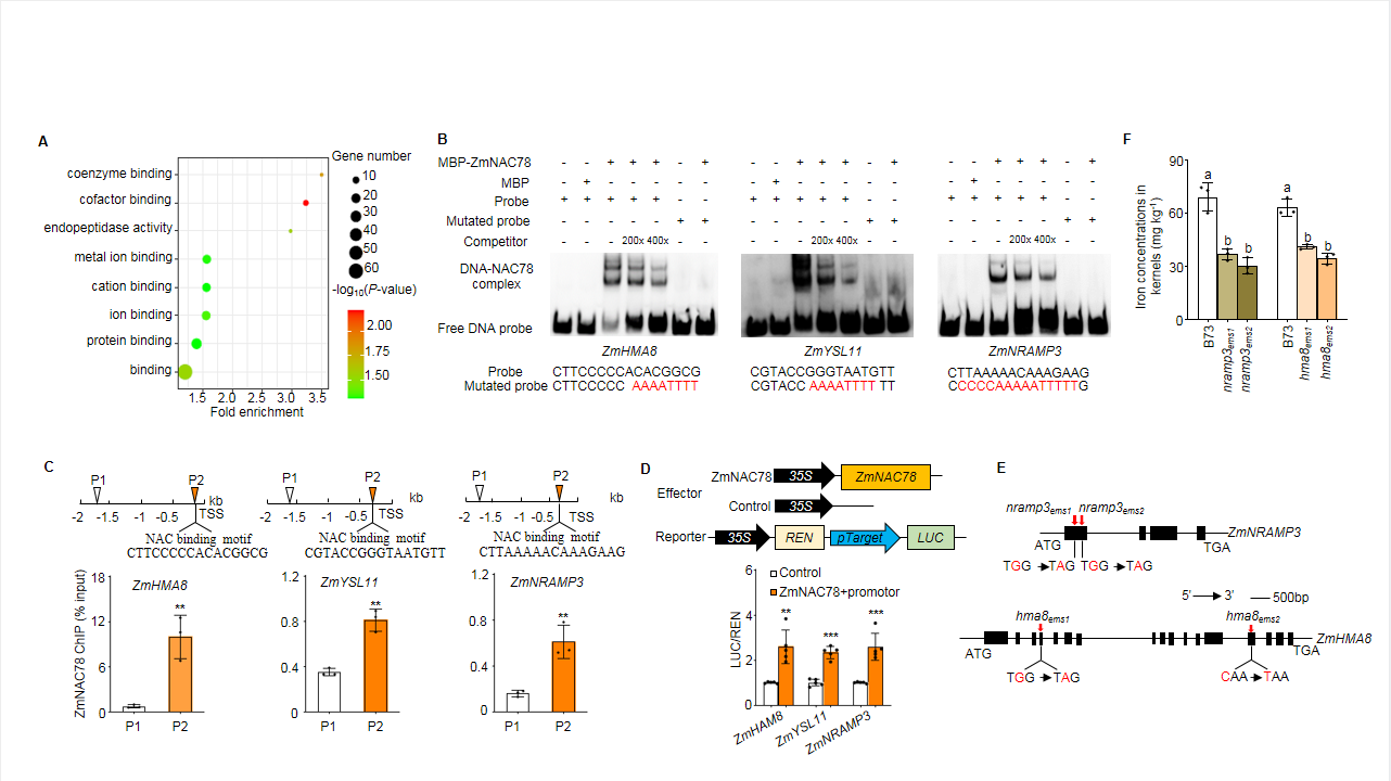 研究人员进一步解析了铁元素如何进入到玉米籽粒的分子路径。实验显示,ZmNAC78在玉米营养物质进入子代的唯一界面—玉米籽粒基底胚乳传递细胞中优势表达,能够直接激活金属离子转运蛋白ZmYSL11、ZmNRAMP3与ZmHMA8。实验证明,3个铁离子转运蛋白均在胚乳发育早期高表达,且这3个铁转运蛋白也在基底胚乳传递细胞表达,与ZmNAC78表达时间、空间位置一致。基因功能缺失突变体实验显示这些金属转运蛋白在铁元素进入玉米籽粒路径中起到重要的作用,明确了在基底胚乳传递细胞中,ZmNAC78和金属转运蛋白共同组成一个分子开关控制铁元素进入玉米籽粒中的转运通路。